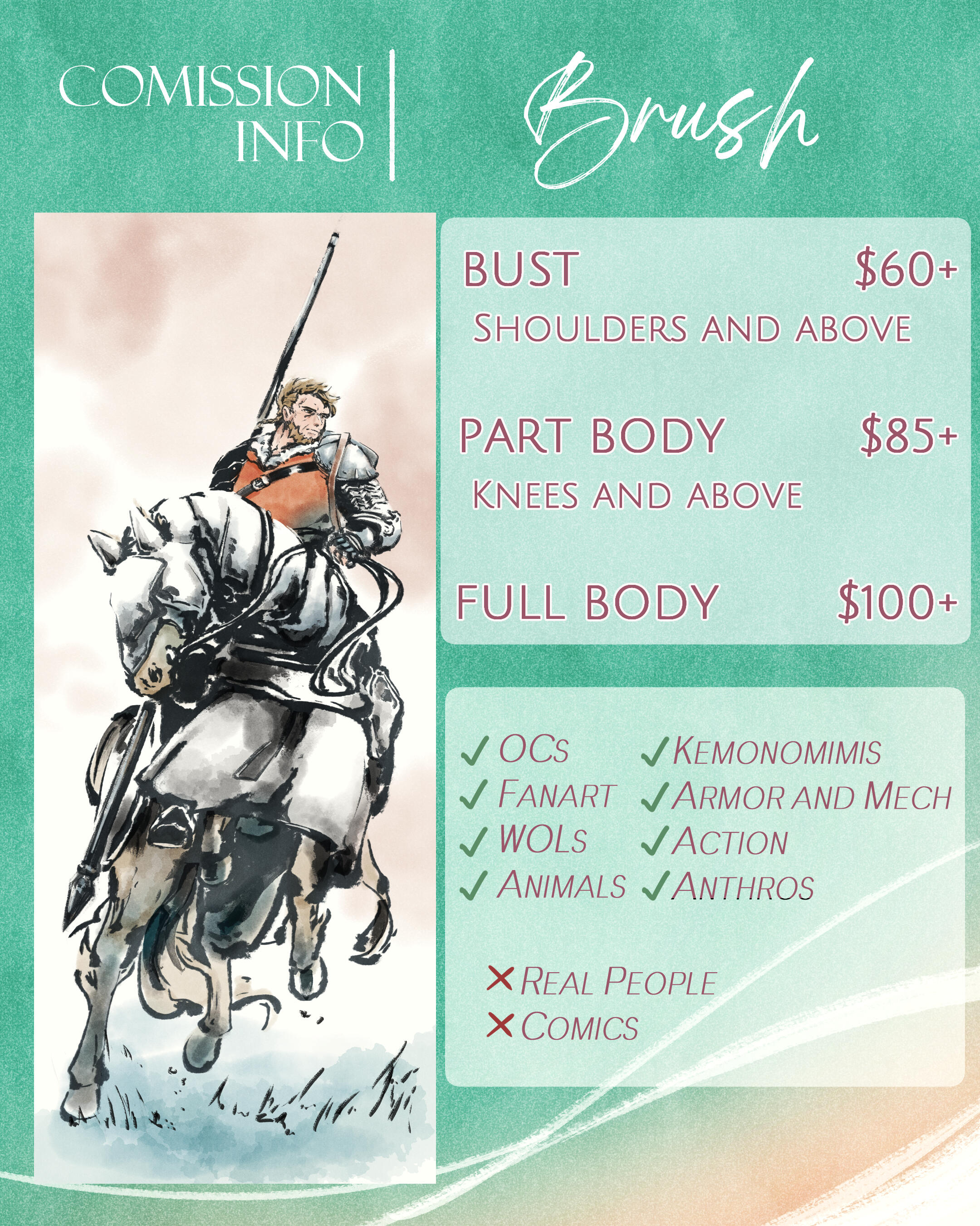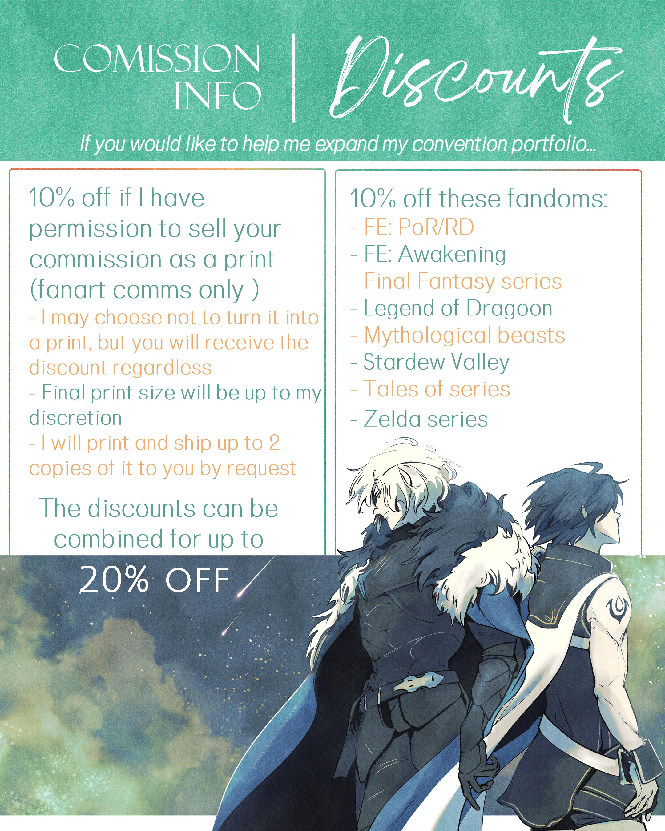 ● All commissions include a flat color or texture background. Scenic backgrounds (ex: architecture, forests) may cost extra based on complexity of the background.● Additional characters are full price.● Highly detailed characters, props, and special effects may cost extra.● 3 sets of revisions are included with illustrations (one set being a single cycle of requesting changes and editing), and 4 are included with comics. Large changes and additional revisions may incur an additional fee of 10% of the original commission cost. Please take your time looking things over so you can submit as many revisions as you can catch at once!